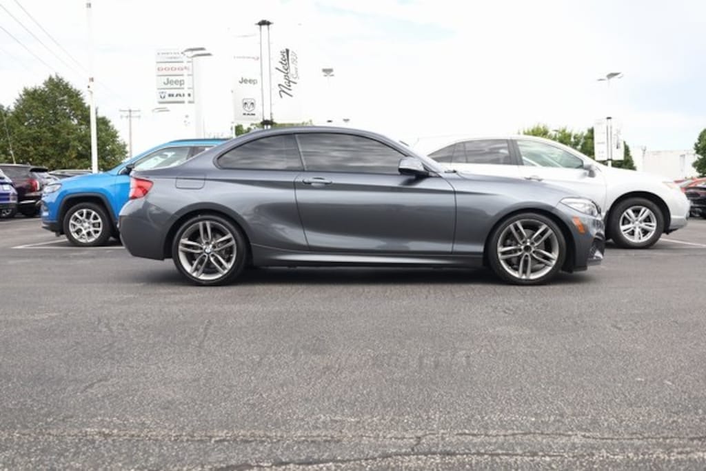 This 2 Series is well equipped with M Sport Package (Aerodynamic Kit, Alum Hexagon Trim w/Estoril Blue Matte Highlight, Ambient Lighting, Auto-Dimming Interior & Exterior Mirrors, Auto-Dimming Rear-View Mirror, Comfort Access Keyless Entry, Increased Top Speed Limiter, Lumbar Support, M Sport Pkg, M Sport Suspension, M Steering Wheel, Moonroof, Rear Spoiler, Shadowline Exterior Trim, SiriusXM Satellite Radio, Wheels: 18" x 7.5" Fr & 18" x 8.0" Rr (Style 461M), and Without Lines Designation Outside), Premium Package (Advanced Real-Time Traffic Information, Apple CarPlay Compatibility, Heated Front Seats, Heated Steering Wheel, Navigation System, Remote Services, Speed Limit Info, and Universal Garage-Door Opener), 4-Wheel Disc Brakes, 6 Speakers, ABS brakes, Adaptive Full LED Lights, Air Conditioning, Alloy wheels, AM/FM radio, Automatic High Beams, Automatic temperature control, Brake assist, Bumpers: body-color, Delay-off headlights, Driver door bin, Driver vanity mirror, Dual front impact airbags, Dual front side impact airbags, Electronic Stability Control, Emergency communication system: BMW Assist eCall, Exterior Parking Camera Rear, Four wheel independent suspension, Front anti-roll bar, Front Bucket Seats, Front Center Armrest, Front dual zone A/C, Front fog lights, Front reading lights, Front Sport Seats, Fully automatic headlights, Hands-Free Bluetooth & USB Audio Connection, Heated door mirrors, Hi-Fi Sound System, Illuminated entry, Knee airbag, Leather Shift Knob, Low tire pressure warning, Occupant sensing airbag, Outside temperature display, Overhead airbag, Panic alarm, Passenger door bin, Passenger vanity mirror, Power door mirrors, Power driver seat, Power Front Seats, Power passenger seat, Power steering, Power windows, Radio data system, Radio: AM/FM Audio System, Rain sensing wipers, Rear anti-roll bar, Rear window defroster, Remote keyless entry, Security system, SensaTec Upholstery, Speed control, Speed-sensing steering, Speed-Sensitive Wipers, Split folding rear seat, Sport steering wheel, Steering wheel mounted audio controls, Tachometer, Telescoping steering wheel, Tilt steering wheel, Traction control, Trip computer, Turn signal indicator mirrors, Variably intermittent wipers, and Wheels: 17" x 7.5" Bi-Color (Style 725).