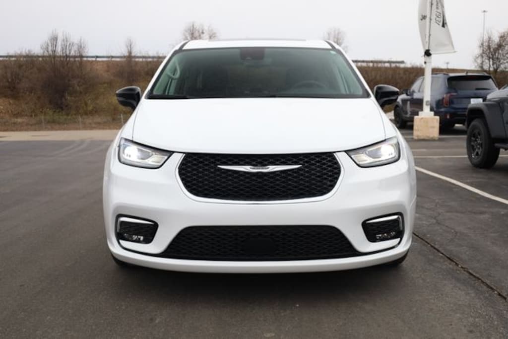 This Pacifica is well equipped with Quick Order Package 27L, 10.1" Touchscreen Display, 17" x 7.0" Aluminum Wheels, 3.25 Axle Ratio, 3rd row seats: split-bench, 4-Wheel Disc Brakes, 6 Speakers, ABS brakes, Air Conditioning, Alloy wheels, AM/FM radio: SiriusXM, Apple CarPlay, Apple CarPlay/Android Auto, Automatic temperature control, Black Seats, Brake assist, Bumpers: body-color, Caprice Leatherette Bucket Seats, Compass, Delay-off headlights, Disassociated Touchscreen Display, Driver door bin, Driver vanity mirror, Driver's Seat Mounted Armrest, Dual front impact airbags, Dual front side impact airbags, Electronic Stability Control, Four wheel independent suspension, Front anti-roll bar, Front Bucket Seats, Front dual zone A/C, Front fog lights, Front reading lights, Fully automatic headlights, Google Android Auto, GPS Antenna Input, Heated door mirrors, Heated front seats, Heated steering wheel, Illuminated entry, Integrated Active Noise Cancellation, Integrated Center Stack Radio, Knee airbag, Low tire pressure warning, Memory seat, Occupant sensing airbag, Outside temperature display, Overhead airbag, Overhead console, Panic alarm, ParkView Rear Back-Up Camera, Passenger door bin, Passenger seat mounted armrest, Passenger vanity mirror, Power door mirrors, Power driver seat, Power Front/Fixed Rear Full Sunroof, Power Liftgate, Power Open/Close Shade, Power steering, Power windows, Radio data system, Radio: Uconnect 5 w/10.1" Display, Rain sensing wipers, Rear air conditioning, Rear reading lights, Rear window defroster, Rear window wiper, Reclining 3rd row seat, Remote keyless entry, Security system, Speed control, Split folding rear seat, Spoiler, Steering wheel mounted audio controls, Tachometer, Telescoping steering wheel, Tilt steering wheel, Touring Suspension, Traction control, Trip computer, Turn signal indicator mirrors, USB Host Flip, Variably intermittent wipers, and Voltmeter.