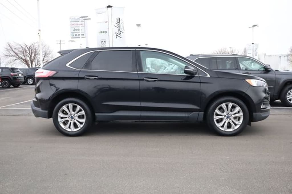 This Edge is well equipped with Equipment Group 300A, 12 Speakers, Auto-dimming Rear-View mirror, Power Liftgate, 3.80 Axle Ratio, 4-Wheel Disc Brakes, ABS brakes, Air Conditioning, Alloy wheels, AM/FM radio: SiriusXM with 360L, Auto High-beam Headlights, Automatic temperature control, Brake assist, Bumpers: body-color, Compass, Delay-off headlights, Driver door bin, Driver vanity mirror, Dual front impact airbags, Dual front side impact airbags, Electronic Stability Control, Emergency communication system: SYNC 4 911 Assist, FordPass Connect, Four wheel independent suspension, Front anti-roll bar, Front Bucket Seats, Front Center Armrest w/Storage, Front dual zone A/C, Front fog lights, Front License Plate Bracket, Front reading lights, Fully automatic headlights, Garage door transmitter, Heated door mirrors, Heated front seats, Heated steering wheel, Illuminated entry, Knee airbag, Leather-Trimmed Heated Sport Bucket Seats, Low tire pressure warning, Memory seat, Occupant sensing airbag, Outside temperature display, Overhead airbag, Overhead console, Panic alarm, Passenger door bin, Passenger vanity mirror, Power door mirrors, Power driver seat, Power passenger seat, Power steering, Power windows, Radio: B&O Sound System by Bang & Olufsen, Rain sensing wipers, Rear anti-roll bar, Rear reading lights, Rear seat center armrest, Rear window defroster, Rear window wiper, Remote keyless entry, Security system, SiriusXM w/360L, Speed control, Speed-Sensitive Wipers, Split folding rear seat, Spoiler, Steering wheel mounted audio controls, SYNC 4A w/Enhanced Voice Recognition, Tachometer, Telescoping steering wheel, Tilt steering wheel, Traction control, Trip computer, Turn signal indicator mirrors, Variably intermittent wipers, and Wheels: 19" Luster Nickel-Painted Aluminum.