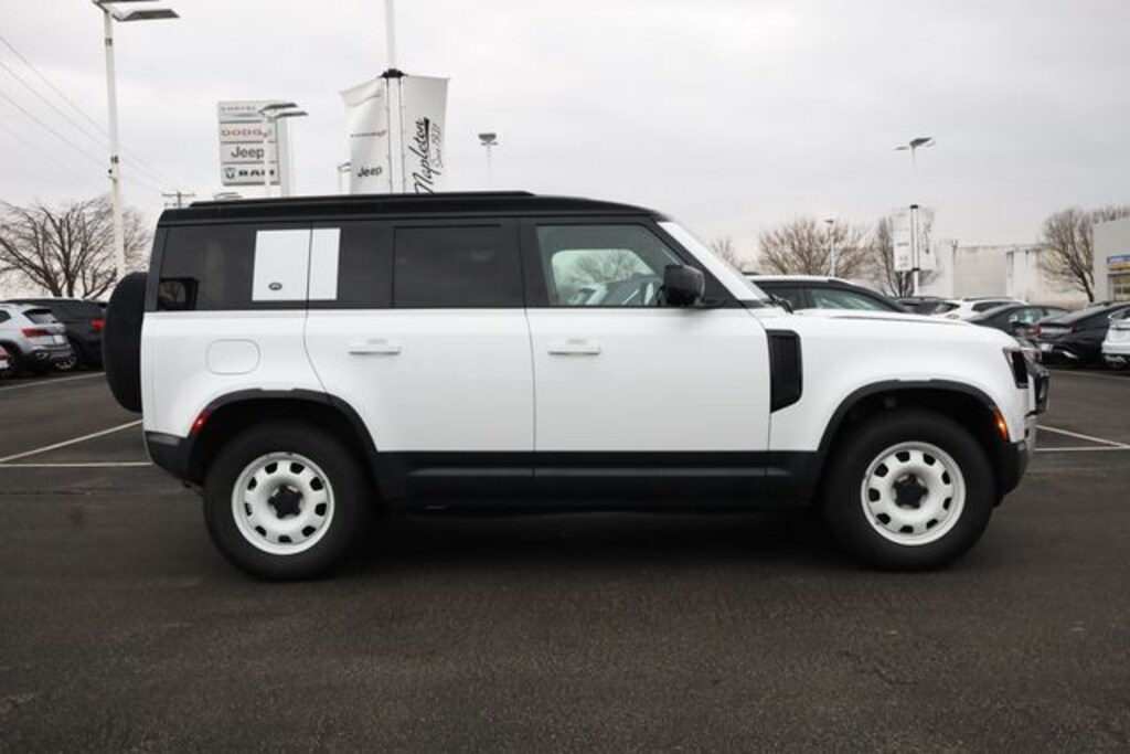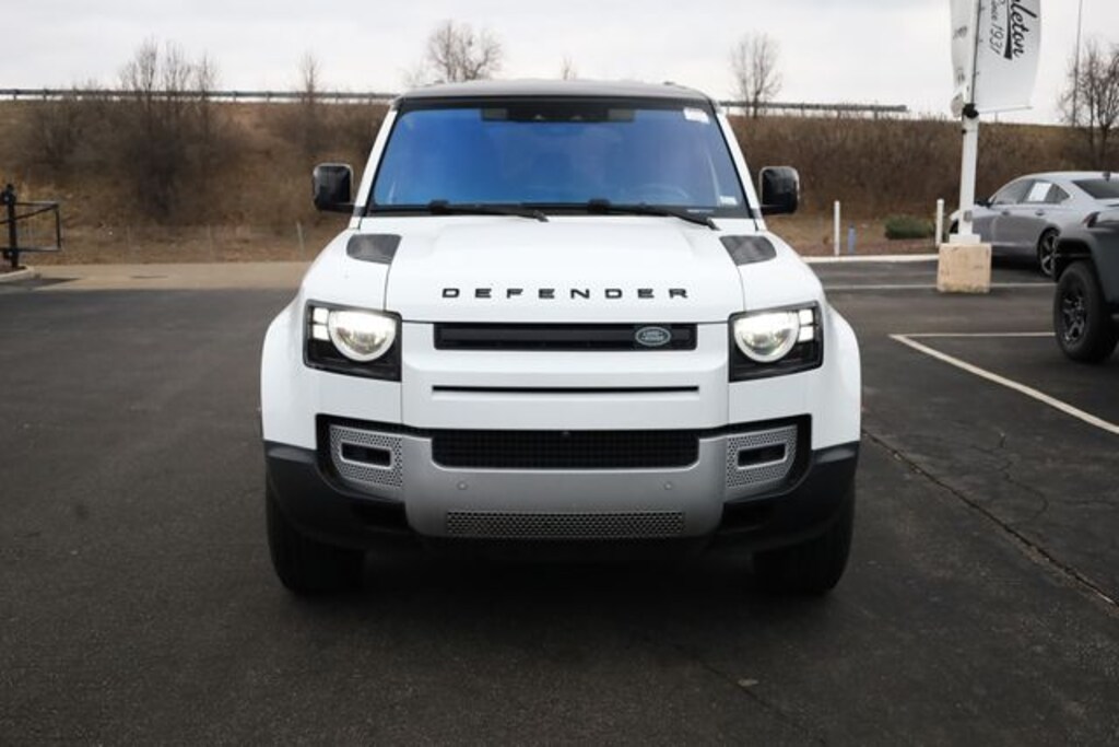 This Defender 110 is well equipped with Apple CarPlay & Android Auto, 4-Wheel Disc Brakes, 4.1 Axle Ratio, 6 Speakers, 8-Way Semi-Powered Seats, ABS brakes, Adaptive suspension, Air Conditioning, AM/FM radio: SiriusXM, Auto-dimming door mirrors, Auto-dimming Rear-View mirror, Automatic temperature control, Brake assist, Bumpers: body-color, Compass, Delay-off headlights, Driver door bin, Driver vanity mirror, Dual front impact airbags, Dual front side impact airbags, Electronic Stability Control, Fabric Seat Trim, Four wheel independent suspension, Front anti-roll bar, Front Bucket Seats, Front Center Armrest, Front dual zone A/C, Front reading lights, Fully automatic headlights, Garage door transmitter: HomeLink, Heated door mirrors, Illuminated entry, Leather Shift Knob, Leather steering wheel, Low tire pressure warning, Navigation system: Connected Navigation PIVI Pro, Occupant sensing airbag, Outside temperature display, Overhead airbag, Overhead console, Panic alarm, Passenger door bin, Passenger vanity mirror, Power door mirrors, Power driver seat, Power passenger seat, Power steering, Power windows, Radio data system, Radio: 180W 6 Speaker Sound System, Rain sensing wipers, Rear anti-roll bar, Rear fog lights, Rear reading lights, Rear window defroster, Rear window wiper, Remote keyless entry, Roof rack: rails only, Security system, Speed control, Speed-sensing steering, Speed-Sensitive Wipers, Split folding rear seat, Steering wheel mounted audio controls, Tachometer, Telescoping steering wheel, Tilt steering wheel, Traction control, Trip computer, Variably intermittent wipers, Weather band radio, and Wheels: 18" Steel Style 5093.