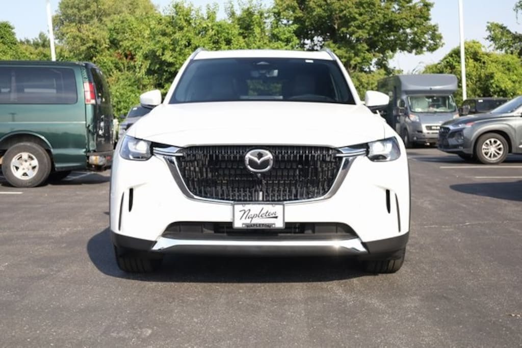 This Mazda CX-90 PHEV is well equipped with 12 Speakers, 3rd row seats: bench, 4-Wheel Disc Brakes, 4.444 Axle Ratio, ABS brakes, Air Conditioning, Alloy wheels, AM/FM radio: SiriusXM, Auto High-beam Headlights, Auto-dimming door mirrors, Auto-dimming Rear-View mirror, Automatic temperature control, Brake assist, Bumpers: body-color, Compass, Delay-off headlights, Digital Rear View Mirror w/HomeLink, Driver door bin, Driver vanity mirror, Dual front impact airbags, Dual front side impact airbags, E911 Automatic Emergency Notification, Electronic Stability Control, Emergency communication system: MAZDA CONNECT, Four wheel independent suspension, Front anti-roll bar, Front Bucket Seats, Front Center Armrest w/Storage, Front dual zone A/C, Front reading lights, Fully automatic headlights, Garage door transmitter: HomeLink, Heads-Up Display, Heated door mirrors, Heated front seats, Heated rear seats, Heated steering wheel, Heated/Ventilated Front Bucket Seats, Illuminated entry, Infotainment System Voice Command, Knee airbag, Leather Shift Knob, Leather steering wheel, Low tire pressure warning, Mazda Connected Services, Mazda Navigation System, Memory seat, Nappa Leather Seat Trim, Navigation system: MAZDA CONNECT, Occupant sensing airbag, Outside temperature display, Overhead airbag, Overhead console, Pandora Internet Radio Integration, Panic alarm, Passenger door bin, Passenger vanity mirror, Power door mirrors, Power driver seat, Power Liftgate, Power moonroof, Power passenger seat, Power steering, Power windows, Radio Broadcast Data System Program Information, Radio data system, Radio: AM/FM w/HD/Bose 12-Speaker Audio System, Rain sensing wipers, Rear air conditioning, Rear anti-roll bar, Rear reading lights, Rear window defroster, Rear window wiper, Remote keyless entry, Rhodium White Premium Paint Charge, Security system, SMS Text Msg Audio Delivery & Reply, Speed control, Speed-sensing steering, Split folding rear seat, Spoiler, Steering wheel mounted audio controls, Tachometer, Telescoping steering wheel, Tilt steering wheel, Traction control, Trip computer, Turn signal indicator mirrors, Variably intermittent wipers, Ventilated front seats, and Wheels: 21" x 9.5J Aluminum Alloy.
