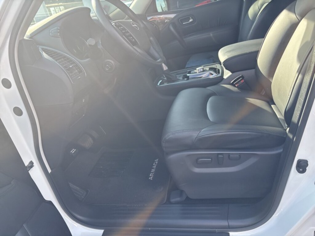 This Armada is well equipped with Cargo Package, Exterior Parking Camera Rear, 18" x 8J Alloy Wheels, 2.937 Axle Ratio, 3rd Row Carpeted Floor Mats - Bench Seat, 3rd row seats: split-bench, 4-Wheel Disc Brakes, 6 Speakers, ABS brakes, Air Conditioning, Alloy wheels, AM/FM radio: SiriusXM, Anti-whiplash front head restraints, Auto High-beam Headlights, Auto tilt-away steering wheel, Auto-dimming Rear-View mirror, Auto-leveling suspension, Automatic temperature control, Brake assist, Bumpers: body-color, Delay-off headlights, Driver door bin, Driver vanity mirror, Dual front impact airbags, Dual front side impact airbags, Electronic Stability Control, Emergency communication system: NissanConnect Services, Four wheel independent suspension, Front anti-roll bar, Front Bucket Seats, Front Center Armrest, Front dual zone A/C, Front fog lights, Front reading lights, Fully automatic headlights, Garage door transmitter: HomeLink, Heated door mirrors, Heated Front Bucket Seats, Heated front seats, Illuminated entry, Knee airbag, Leather Shift Knob, Leather steering wheel, Leatherette Seat Trim, Low tire pressure warning, Navigation System, Occupant sensing airbag, Outside temperature display, Overhead airbag, Overhead console, Panic alarm, Passenger door bin, Passenger vanity mirror, Power door mirrors, Power driver seat, Power passenger seat, Power steering, Power windows, Radio: NissanConnect w/SiriusXM, Rear air conditioning, Rear anti-roll bar, Rear reading lights, Rear seat center armrest, Rear window defroster, Rear window wiper, Reclining 3rd row seat, Remote keyless entry, Security system, Speed control, Speed-sensing steering, Speed-Sensitive Wipers, Split folding rear seat, Spoiler, Steering wheel mounted audio controls, Tachometer, Telescoping steering wheel, Tilt steering wheel, Traction control, Trip computer, Turn signal indicator mirrors, Variably intermittent wipers, and Voltmeter.