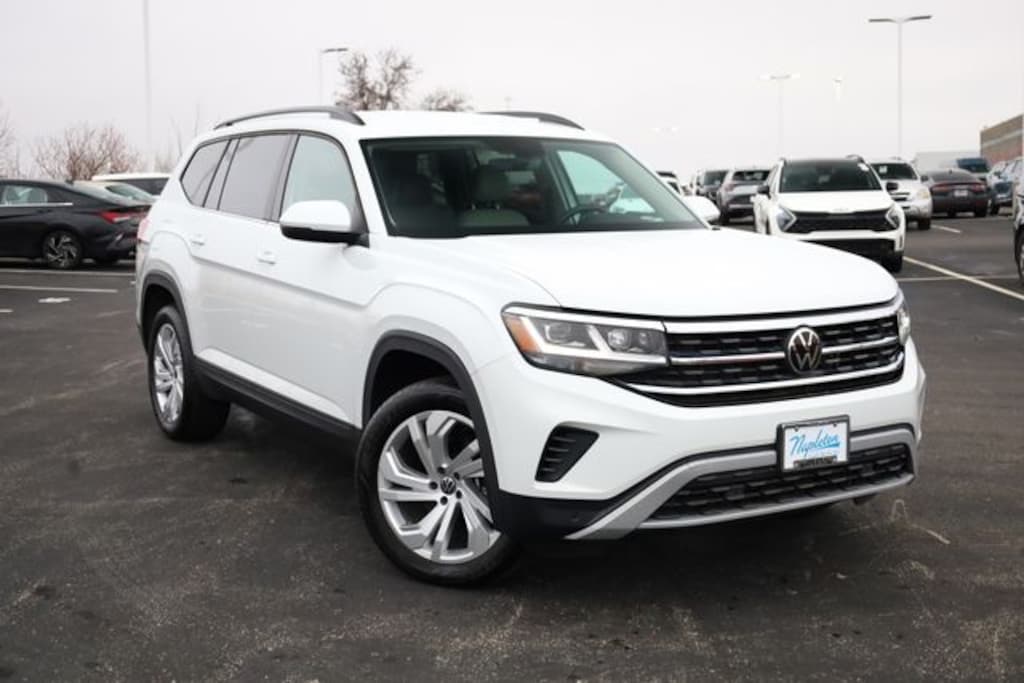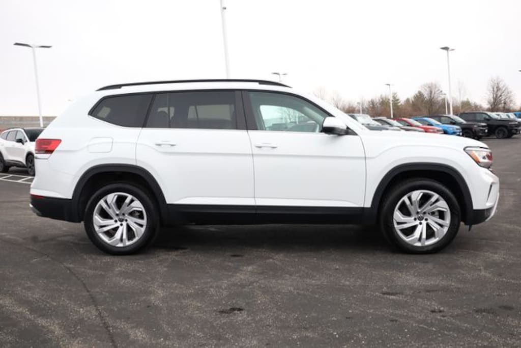 This Atlas is well equipped with Power Liftgate, 3.60 Axle Ratio, 3rd row seats: split-bench, 4-Wheel Disc Brakes, 6 Speakers, ABS brakes, Air Conditioning, Alloy wheels, AM/FM radio: SiriusXM with 360L, Auto-dimming Rear-View mirror, Automatic temperature control, Brake assist, Bumpers: body-color, Carpeted Mats - Bench Seats, Carpeted Mats Kit - Bench Seat, Compass, Delay-off headlights, Driver door bin, Driver vanity mirror, Dual front impact airbags, Dual front side impact airbags, Electronic Stability Control, Emergency communication system: VW Car-Net Safe & Secure 5-year, Exterior Parking Camera Rear, Four wheel independent suspension, Front anti-roll bar, Front Bucket Seats, Front Center Armrest, Front dual zone A/C, Front fog lights, Front reading lights, Fully automatic headlights, Heated Comfort Front Bucket Seats, Heated door mirrors, Heated front seats, Heavy Duty Trunk Liner w/VW CarGo Blocks, Illuminated entry, Leather Shift Knob, Low tire pressure warning, Occupant sensing airbag, Outside temperature display, Overhead airbag, Overhead console, Panic alarm, Passenger door bin, Passenger vanity mirror, Perforated V-Tex Leatherette Seating Surfaces, Power door mirrors, Power driver seat, Power steering, Power windows, Radio data system, Radio: MIB3 Composition Media w/8" Touchscreen, Rain sensing wipers, Rear air conditioning, Rear anti-roll bar, Rear reading lights, Rear seat center armrest, Rear window defroster, Rear window wiper, Remote keyless entry, Security system, Speed control, Speed-sensing steering, Split folding rear seat, Spoiler, Standard Suspension, Steering wheel mounted audio controls, Tachometer, Telescoping steering wheel, Tilt steering wheel, Traction control, Trip computer, Turn signal indicator mirrors, Variably intermittent wipers, VW Car-Net Safe & Secure 5-Year Plan, and Wheels: 20" x 8J 5-Spoke Silver Painted Alloy.